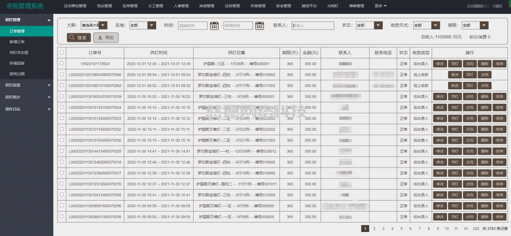 供燈數(shù)據(jù)后臺,善款清晰明了,供燈狀態(tài)一目了然,善款一鍵導(dǎo)出方便統(tǒng)計