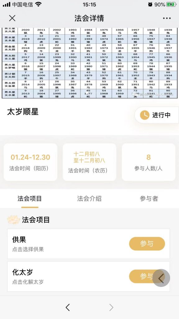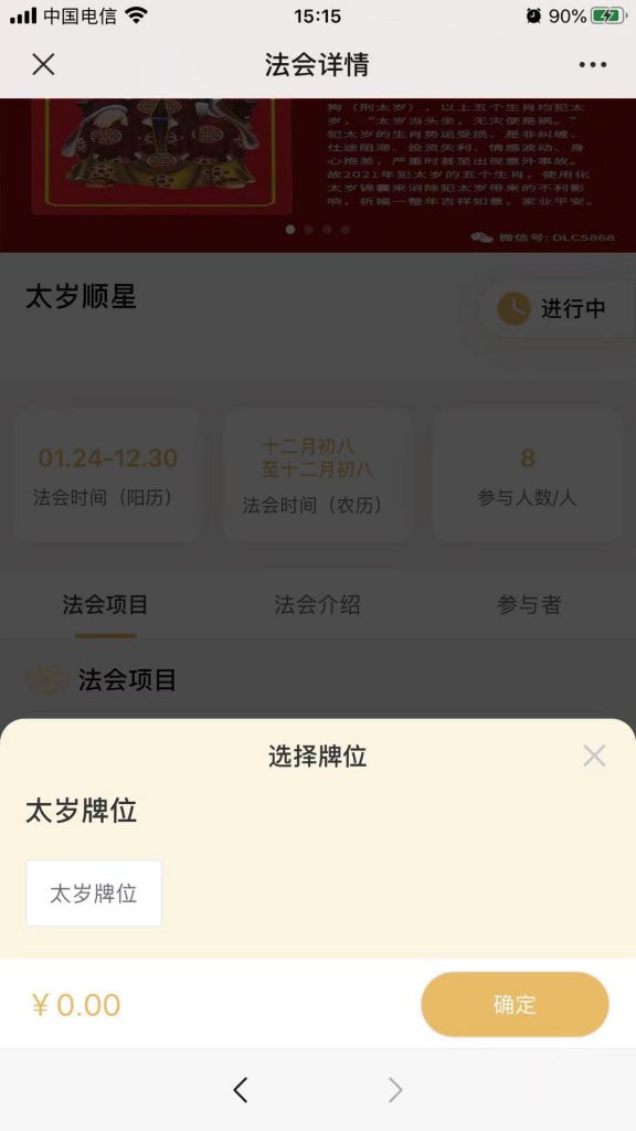 4、法會板塊隨喜功能文案頂部配置,可自定義隨喜法會項目選項(放生修福、供燈祈福,牌位供奉或化太歲等隨喜法會項目按鍵),信眾指尖促達(dá)隨喜供奉。